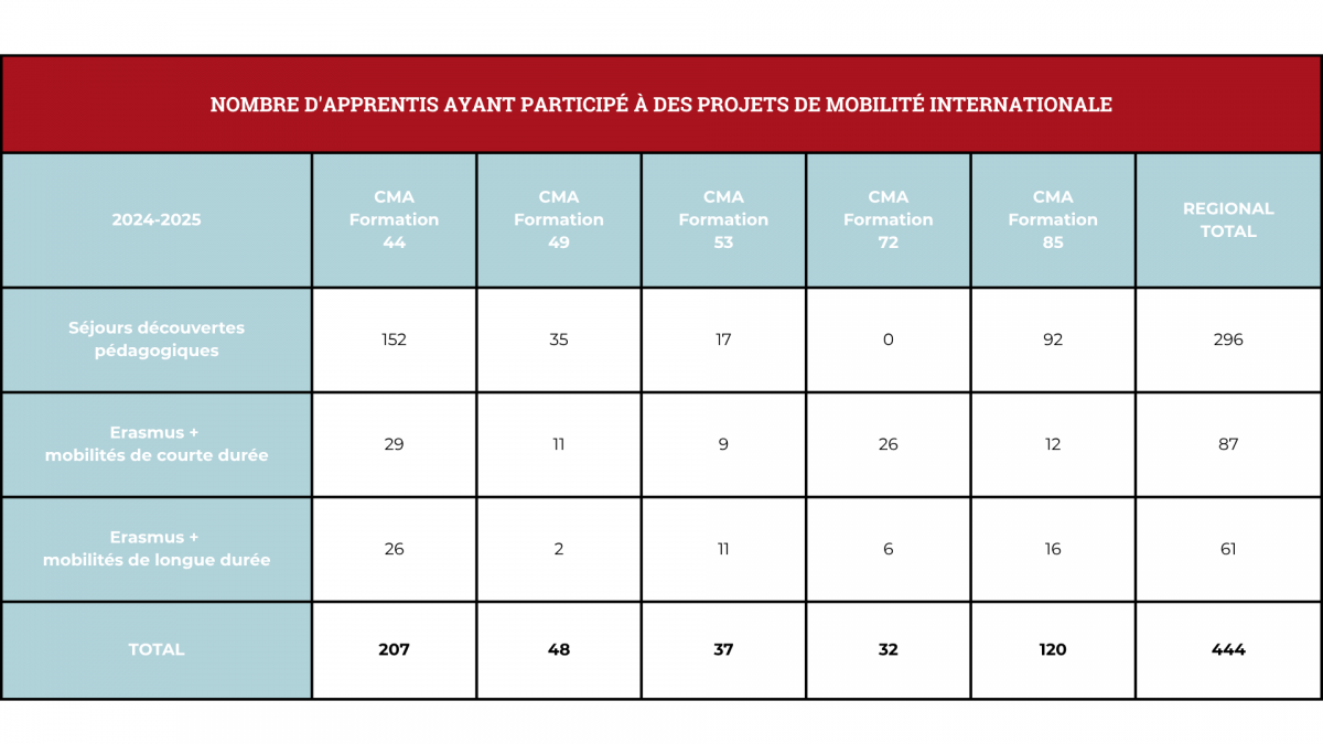 Ce projet, réalisé dans le cadre du programme d'investissement " Compétences et métiers d'avenir - France 2030 " en lien avec une quarantaine de structures de formation professionnelle en France (dont la CMA Pays de la Loire) et piloté par Euro App Mobility, vise à développer la mobilité internationale de longue durée (2 à 12 mois) des apprentis dans leur cursus de formation professionnelle. Plusieurs dizaines d’apprenants ont déjà réalisé une mobilité internationale (envoi / accueil) dans le cadre de ce projet.