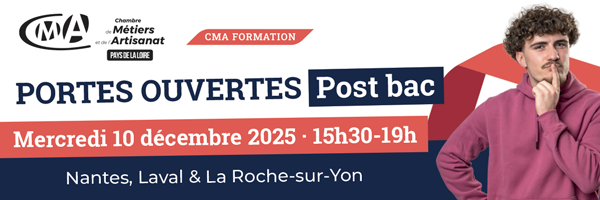Après le bac, tu souhaites poursuivre ton parcours en alternance ? Viens découvrir des formations concrètes, professionnalisantes et reconnues le mercredi 10 décembre 2025 de 15h30 à 19h : les sites de CMA Formation Nantes, Laval et La Roche-sur-Yon t'ouvrent leurs portes pour une après-midi dédiée à l’orientation et à la découverte des filières artisanales.
